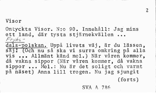 //// 2 //// Visor //// Omtyckta Visor. N:o 90. Innehåll: Jag mins ett land, där tysta stjärnekvällen ... //// FhyA% - //// dals-polskan. Uppå livets väj, är du lässen, säj I (Och nu så ska vi surra omkring på alla vis ... Allmänt känd mel.) När våren kommer, då vakna sippor (När våren kommer, då vakna sippor ... Mel.: Nu är det soligt och varmt på näset) Anna lill trogen. Nu jag sjungit //// (forts) //// SVA k 786 ////