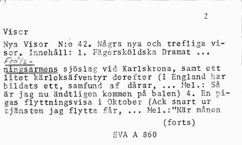 //// 2 //// Visor //// Nya Visor N:o 42. Några nya och trefliga visor. Innehåll: 1. Fägersköldska Dramat ... //// fr»*A - //// ningsarmens sjöslag vid Karlskrona, samt ett litet kärleksäfventyr derefter (I England har bildats ett, samfund af dårar, ... Mel.: Så är jag nu ändtligen kommen på balen) 4. En pigas flyttningsvisa i Oktober (Ack snart ur tjänsten jag flytta får, ... Mel.:"När månen //// (forts) //// SVA A 360 ////