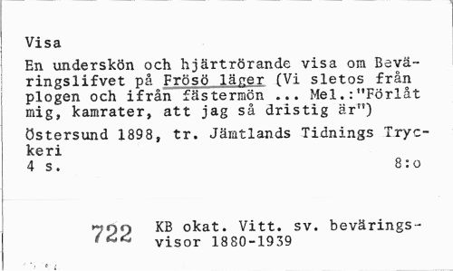 //// Visa //// En underskön och hjärtrörande visa om Bevä-ringslifvet på Frösö läner (Vi sletos från plogen och ifrån fästermön ... Mel. .-"Förlåt mig, kamrater, att jag så dristig är") //// Östersund 1898, tr. Jämtlands Tidnings Tryckeri //// 4 s. 8:0 //// nnn KB okat. Vitt. sv. bevärings- //// (visor 1880-1939 //// •' * ¦ t- f ////