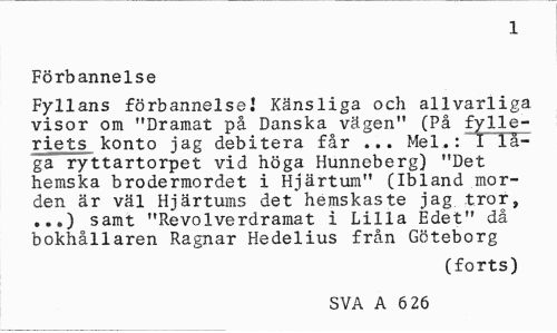 //// 1 //// Förbannelse //// Fyllans förbannelse.1 Känsliga och allvarliga visor om "Dramat på Danska vägen" (På fylleriets konto jag debitera får ... Mel.: I låga ryttartorpet vid höga Hunneberg) "Det hemska brodermordet i Hjärtum" (Ibland morden är väl Hjärtums det hemskaste jag tror, ...) samt "Revolverdramat i Lilla Edet" då bokhållaren Ragnar Hedelius från Göteborg //// (forts) //// SVA A 6 26 ////
