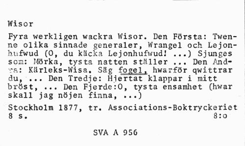 //// Wisor //// Fyra werkligen wackra Wisor. Den Första: Twen-ne olika sinnade generaler, Wrangel och Lejon-hufwud (0, du käcka Lejonhufwud.1 ...) Sjunges som: Mörka, tysta natten ställer ... Den Andra: Kärleks-Wisa. Säg fogel, hwarför qwittrar du, ... Den Tredje: Hjertat klappar i mitt bröst, ... Den Fjerde:0, tysta ensamlie t (hwar skall jag nöjen finna, ...) //// Stockholm 1877, tr. Associations-Boktryckeriet 8 s. 8: o //// SVA A 956 ////