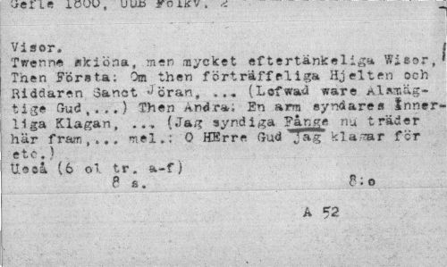 //// Visor. //// Twenn* Bkiona, men mycket eftertänkeli^a Wisor, Then Första; Om then förträffeliga Hjelten och Riddaren 3a.nct J öran, ... (Lofwad »are Alsmag-tige Gud,...'} Then Andra; En arm syndare» Innerliga Klagan, ... (Jag syndiga Fånge nu träder här fram,.,, mel.; O HErr« Gud jag klagar fcr etc,} //// Useå (6 ol tr. a-f) //// 5a. o //// A ////