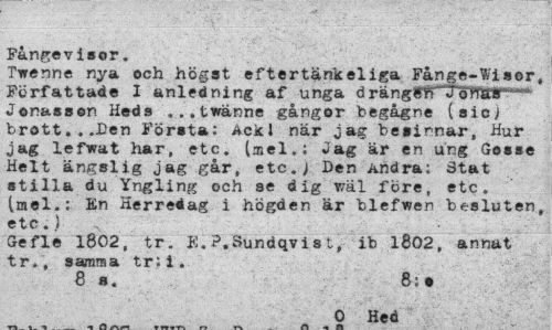 //// Fångevisor. //// Twenne nya och högst eftertänkeliga Fånge-Wiser, Författade I anledning af unga dräng^^CTdffair ~ Jonasson Heds ...twänne gångor begågne (sic) brott...Den Första; Ackl när jag besinnar, Hur jag lefwat har, etc. (mel.: »iag är en ung Gosse Helt ängslig jag går, etc.J Den Andra; Stat stilla du Yngling och se dig wäl före, etc. (mel.; En Herredag i högden är blefwen besluten, etc.) //// Gefle 1802, tr. E. P.Sundqvi s t, ib 1802, annat tr., samma tr: i. //// 8 8. 8; • //// 0 Hed ////