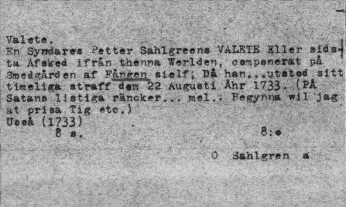 //// ' " •¦ ' "•' .'*•• '<" " .•--'•',' V V '¦ " • • ii . . . vi -v,- " ... //// fcy ; 'v' ? ' y' < v " //// Val ete. //// En Syrrdare» Petter Sahlgreens VALETE Eller sidsj ta Af sked ifrån thenna Werlden, cs-npsnerat på 1 //// han...utstod sitt tim el i ga, straff dtri22 Augusti Åhr 1733. (Pil Satans listiga räncker... Pegynm w 1 jag //// at prisa Tig etc.) J • //// (1733) //// 8 •• 8:* //// 0 Sahlgren a ////