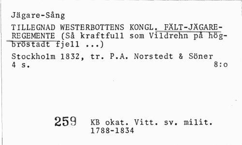 //// Jägare-Sång //// TILLEGNAD WESTERBOTTENS KONGL. FÄLT-JÄGAREREGEMENTE (Så kraftfull som Vildrehn pä hög-bröstadt tjell ...) //// Stockholm 1832, tr. P.A. Norstedt & Söner 4 s. 8:0 //// 259 KB okat. Vitt. sv. milit. //// 1788-1834 ////