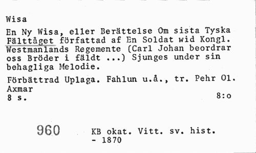 //// Wisa //// En Ny Wisa, eller Berättelse Om sista Tyska Fälttåget författad af En Soldat wid Xongl. Westmanlands Regemente (Carl Johan beordrar oss Bröder i fäldt ...) Sjunges under sin behagliga Melodie. //// Förbättrad Uplaga. Fahlun u.å., tr. Pehr 01. Axmar //// 8 s. 8:0 //// 960 KB okat. Vitt. sv. hist. //// - 1870 ////