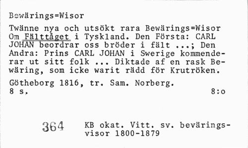 //// Bsi\rärings=Wisor //// Twänne nya och utsökt rara Bewärings=Wisor Om Fälttåget i Tyskland» Den Första: CARL JOHAN beordrar oss bröder i fält Den //// Andra: Prins CARL JOHAN i Swerige kommenderar ut sitt folk ... Diktade af en rask Be-wäring, som icke warit rädd för Krutröken. //// Götheborg 1816, tr. Sam. Norberg. 8 s. 8:0 //// Q£4 KB okat. Vitt. sv. bevärings- //// visor 1800-1879 ////