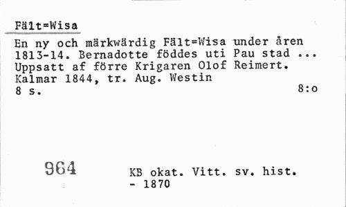 //// Fält=Wisa //// En ny och märkwärdig Fält=Wisa under åren 1813-14. Bernadotte föddes uti Pau stad ... Uppsatt af förre Krigaren Olof Reimert. Kalmar 1844, tr. Aug. Westin 8 s. 8:o //// 964 KB okat. Vitt. sv. hist. //// - 1870 ////