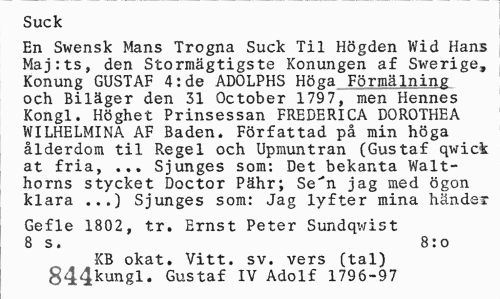 //// Suck //// En Swensk Mans Trogna Suck Til Högden Wid Hans Maj:ts, den Stormägtigste Konungen af Swerige, Konung GUSTAF 4:de ADOLPHS Höga Förmälning och Biläger den 31 October 1797, men Hennes Kongl. Höghet Prinsessan FREDERICA DOROTHEA WILHELMINA AF Baden. Författad på min höga ålderdom til Regel och Upmuntran (Gustaf qwick at fria, ... Sjunges som: Det bekanta Walt-horns stycket Doctor Pähr; Se^n jag med ögon klara ...) Sjunges som: Jag lyfter mina händer //// Gefle 1802, tr. Ernst Peter Sundqwist 8 s. 8:o //// KB okat. Vitt. sv. vers (tal) 844kunS1' Gustaf IV Adolf 1796-97 ////