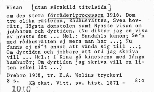 //// Visan ) utan särskild titelsida"! //// Tmm //// om den Stora förräderiprocessen 1916. Dom tre olika rätterna, Rådhusrätten, Svea hovrätt, Högsta domstolen samt Nyaste visan om jobbaren och dyrtiden. (Nu diktar jag en visa av nyaste don ... Mel.: Sandahls kanon; Se**n med rådhusrätten ej mera man har ...; Nu fanns ej nå"t annat att vända sig till Om dyrtiden och jobbare ett ord jag skriva vill ... Mel.: I Kina gå kineserna med långa bamburör; Om dyrtiden jag skriva vill en liten enkel låt ...) //// Örebro 1916, tr. E.A. Welins tryckeri 8 s* K& okat. Vitt. sv. hist. 1871 - 8:0 //// mm ////
