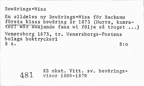 //// Bewärings=Wisa //// En alldeles ny Bewärings=Wisa för Backamo första klass bewäring år 18 73 (Hurra, kamrater! war~swäjande fana wi följa så troget ...) //// Wenersborg 1873, tr. V/enersborgs-Postens bolags boktryckeri //// 8 s. 8: o //// 4 C O XB okat. Vitt. sv, bevärings- //// a ' ' visor 1800-1879 ////