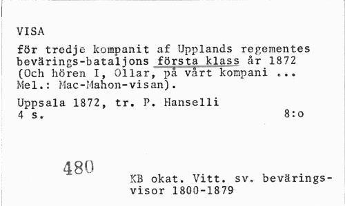 //// VISA //// för tredje kompanit af Upplands regementes bevärings-bataijons första klass år 1872 (Och hören I, Ollar, pä vårt kompani ... Me1.: Mac-Mahon-vi s an). //// Uppsala 1872, tr. P. Hanselli 4 s. 8: o //// 480 //// KB okat. Vitt. sv, bevärings- //// visor 1800-1879 ////