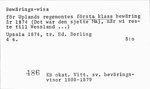 //// Bewärings-wisa //// för Uplands regementes första klass bewäring år 1874 (Det war den sjette Maj, när v/i reste till Wessland „..) //// Upsala 1874, tr. Ed. Berling 4 s. 8:o //// 486 KB okat. Vitt. sv. bevärings- //// visor 1880-1939 ////