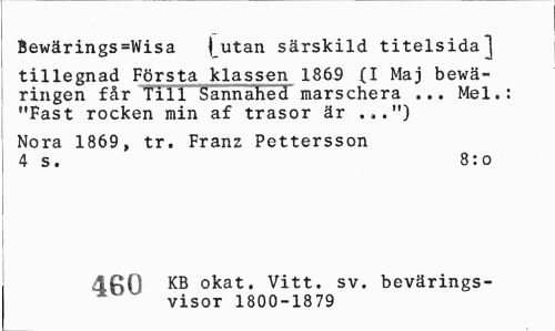 //// Bewärings=Wisa |utan särskild titelsida] //// tillegriad Första klassen 1869 (I Maj bewä-ringen får TTT1 Sannahed marschera ... Mel.: "Fast rocken min af trasor är ...") //// Nora 1869, tr. Franz Pettersson 4 s. 8:o //// 4 C O XB okat. Vitt. sv, bevärings- //// a ' ' visor 1800-1879 ////