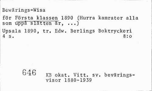 //// Bewärings=Wisa //// för Första klassen 1890 (Hurra kamrater alla som uppa~slätten är, ...) //// Upsala 1890, tr. Edw. Berlings Boktryckeri 4 s. 8:o //// 646 XB okat. Vitt. sv. bevärings- //// visor 1880-1939 ////