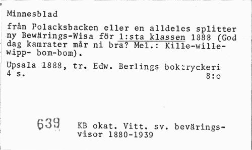 //// Minnesblad //// från Polacksbacken eller en alldeles splitter ny Bewärings-Wisa för l:sta klassen 1888 (God dag kamrater mår ni bra?'Mel.: Kille-wille-wipp- bom-bom) . //// Upsala 1888, tr. Edw. Berlings boktryckeri 4 s. 8:o //// ^39 KB okat. Vitt. sv. bevärings- //// visor 1880-1939 ////