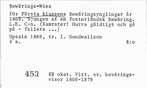 //// Bewärings=Wisa //// för Första klassens Bewäringsynglingar år 1869. "Sjungen af en Fosterländsk Bewäring. L.E. C-n. (Kamrater! Hurra gäldtigt och gå på - fallera ...) //// Upsala 1869, tr. I. Sundwallson 4 s. 8:o //// KB okat. Vitt. sv. bevärings- //// 474 visor 1800-1879 ////