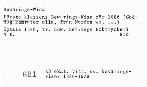 //// Bewärings-Visa //// Första klassens Bewärings-Wisa för 1886 (God-cTåg kamrater alla, från Norden wi, ...) //// Upsala 1886, tr. Edw. Berlings Boktryckeri 4 s. 8 :o //// pr-p KB okat. Vitt. sv. bevärings- //// bOb visor 1880-1939 ////