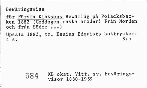 //// Bewäringswisa //// för Första Klassens Bewäring på Polacksbacken 1882 (Goddagen raska bröder.' Från Norden och från Söder ...) //// Upsala 1882, tr. Esaias Edquists boktryckeri 4 s. 8 :o //// KO/t KB okat. Vitt. sv. bevärings- //// visor 1880-1939 ////