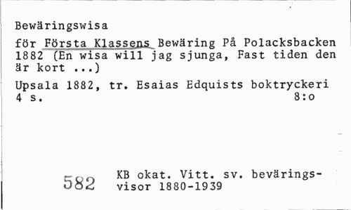 //// Bewäringswisa //// för Första Klassans Bewäring På Polacksbacken 1882 (En wisa will jag sjunga, Fast tiden den är kort ...) //// Upsala 1882, tr, Esaias Edquists boktryckeri 4 s. 8:o //// j-QO KB okat. Vitt. sv. bevärings- //// OötZ Visor 1880-1939 ////