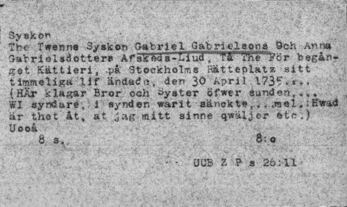 //// Sy ek or» //// The Twenne Syskon Gabriel Gabrielsons Öch Anna Gabrielsööt t *r s AfsVfcda-riuTrTTT&T^ör begånget Kättieri, på Stockholms Rätteolatz sitt timmeliga lif ändad«, den 30 April 1731;.»,. (HÄjr klagar Bror och byster Öfwer sunden, .,. WI syndare, 1 synden warit sänokte,,, .mel.: Rwad ar thet åt , at Jag mitt sinne qwälj er Me .) Uooå //// ös. 8:o //// ; • UUB Z P s 25:11 ////