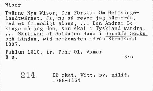 //// Wisor //// Twänne Nya Wisor, Den Första: Om Hellsinge» Landtwärnet. Ja, nu så reser jag härifrån, med et frimodigt sinne, ... Den Andra: Beklaga må jag dem, som skal i Tyskland wandra, ... Skrifwen af Soldaten Hana i Gagnäfs Sockn och Lindan, wid hemkomsten ifrån Stralsund 1807. //// Fahlun 1810, tr. Pehr 01. Axmar 8 s. 8:o //// 214 KB okat. Vitt. sv. milit. //// 1788-1834 ////