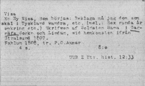 //// Vi sa //// En Ny Wisa, Som börja» BeVl&ga må j-ag som skal i Tyskland wandra, etc. (nel.: Sex runda år omkring etc») Skrifwen af Soldaten Hana i Gag-näf a. Sorkr och Lindan, wid hemkom 31 en ifrån**** Stralsund 1 607. Fahlun l80g, tr. P.C.A>^ar . //// O ( //// 4 s. o; o //// UUB Z Utv. hiat. 12:33 ////