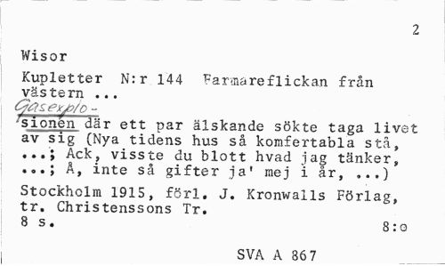 //// 2 //// Wisor //// Kupletter N:r 144 Farmareflickan från västern ... //// e^/o - //// slönen där ett par älskande sökte taga livet av sig (Nya tidens hus så komfertabla stå, ...; Ack, visste du blott hvad jag tänker, A, inte så gifter ja' mej i år, ...) //// Stockholm 1915, förl. J. Kronwalls Förlag, tr. Christenssons Tr. //// 8 s. 8:o //// SVA A 86 7 ////