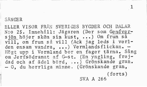 //// 1 //// SÅNGER //// ELLER VISOR FRÄN SVERIGES BYGDER OCH DALAR N:o 25. Innehåll: Jägaren (Der som Genéver-sjön höjer skön sin kust, ...) Om frun så vill, om frun så vill (Ack jag leds i verl-den ensam vandra, ...) Vermlandsflickan. — Högt upp i Vermland bor en fager tärna. Sång om Jerfsödramat af G-st. (En yngling, frejdad och af ädel börd, »..) Grönskande gran. — 0, du herrliga minne, (Grönskande gran, //// (forts) //// SVA A 266 ////