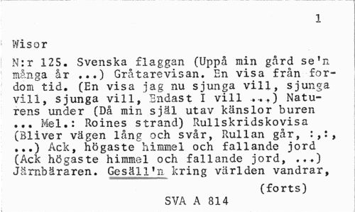 //// 1 //// Wisor //// N:r 125. Svenska flaggan (Uppå min gård se'n många år ...) Gråtarevisan. En visa från fordom tid. (En visa jag nu sjunga vill, sjunga vill, sjunga vill, Endast I vill .-..) Naturens under (Då min själ utav känslor buren ... Mel.: Roines strand) Rullskridskovisa (Bliver vägen lång och svår, Rullan går, ...) Ack, högaste himmel och fallande jord (Ack högaste himmel och fallande jord, ...) Järnbäraren. Gesäll'n kring världen vandrar, //// (forts) //// SVA A 814 ////
