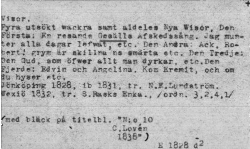 //// VHor. //// Fyra utsökt wackra sa^t aldele» Nya Wisor, Ben Fcrst»; resande "reaälls Afskedssårg. Jag mun» ter alla dagar T*-f>åt, '"el c . Ben. A^ra: Ack, Robert.' gryrc är »kilIna ns smarta sto. Ben Tredje; Hen Stod, som öfwer allt man dyrkar, etc,Ben Fjärde: Edvin och Angelina. Kons Krewit, och om öu hyser etc, //// Jcnköpirrtff 1828, ib 1831, tr, N.J..Lundström. tfexic 1832, tr. S.Rasks Enka., /ordn. 3.2,4,1/ //// /med bläck på titelbl. •Ni.o#XO 1 * C.Loven //// 1836"; - //// v Tft'vP, ////