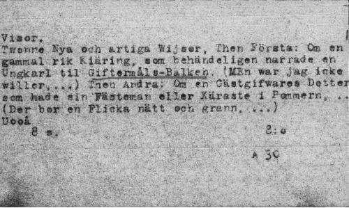 //// Visor. //// Twe»r« Kya och artiga %ijsor, Thon Första; 0® en gammal rik Kiäring, sam fcéhändeligen narrade en Ungkarl til Giftoraal»rBjjOfop¦ (Kin war jag icke willer, ,.«) xaStt Andra: Om en Gästgifwares Dettej eom hade sin'FUsteman eller Xiiraito i Pommern, . (Der hor en Flicka nätt och grann, ,..) Uooå //// 8 s. 3:o //// ¦jfci-.'- ////