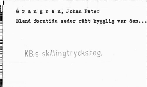 //// J Grangren, Johan Peter //// ! Bland forntida seder räit hygglig var den.., //// \ KB s skillingtrycksreg. //// I ////