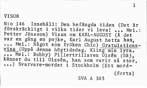 //// 1 //// VISOR //// N:o 146 Innehåll: Den befängda tiden (Det är förskräckligt i vilka tider vi levaj ... Mel.: Petter Jönsson) Visan om KARL-AUGUST (A det var en gång en pojke, Karl August hetta han, ... Mel.: Något som fröken Chic) Gratulations-visa (Uppå denna högtidsdag. Kling min lyra. ... Mel.: Bobby) Pillertrillaren Olsén (Säj, känner du till Olssén, han som varit så stor, ...) Svarvare-mordet i Stockholm (Ett mord- //// (forts) //// SVA A 30 3 ////