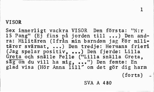 //// 1 //// VISOR //// Sex innerligt vackra VISOR Den första: "N:r 15 Pang" (Ej fins på jorden till ..,) Den andra: Militären (Ifrån min barndom jag För militärer svärmat, ...) Den tredje: Hermans frieri (Jag spelar positiv, •••) Den fjerde: Lilla Greta och snälle Pelle ("Lilla snälla Greta, säg om du vill ha mig, ...") Den femte: En glad visa (Hör Anna lill" om det gör dig harm //// (forts) _ //// SVA A 4 80 ////