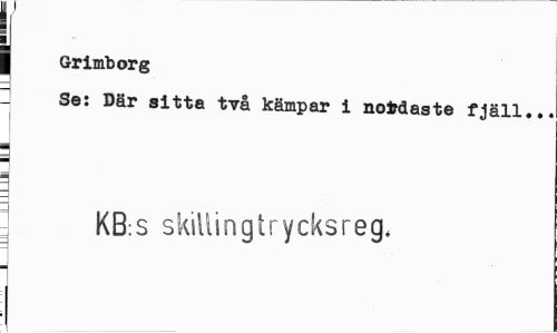 //// 1/ I i_ //// j Grimborg //// Se: Där sitta två kämpar i notdaste fjäll... //// | KB.s skillingtrycksreg, //// _ ////