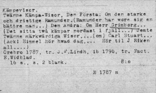 //// Kämpeviscr. //// Twänne Kämpa-Wiaor, De^ Första; Ort den starke och dristige Ramunder.(Ramunder har wore. sig en bätt re man.».) Den Andra: Om Herr jSrimborg., . (Det sitta twå kämpar nordast i fjäTTTTTT "Jemte Twänne märkvärdiga Wisor, .. .( om } Carl Stuart. . . (Ack! Himmel hör hwad dag,... Hör til J Riken //// Örebro"178?, tr. j.^.Lindh, ib 17V6. tr. Fact. F.. Wid fclad . //// 16 s., a . 2 blank. 8; o //// E 1.787 n ////
