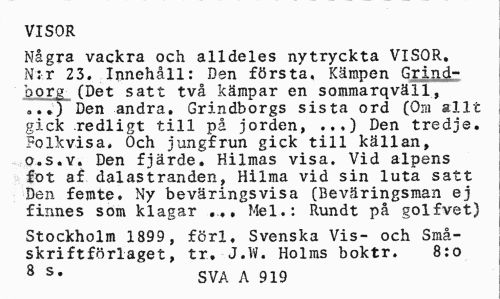 //// VISOR //// Några vackra och alldeles nytryckta VISOR. N;r 23. Innehåll: Den första, Kämpen Grindborg (Det satt två kämpar en sommarqväll, o..) Den andra. Grindborgs sista ord (Om allt gick redligt till på jorden, ...) Den tredje. Folkvisa. Och jungfrun gick till källan, o.s.v. Den fjärde. Kilmas visa. Vid alpens fot af dalastranden, Hilma vid sin luta satt Den femte. Ny beväringsvisa (Beväringsman ej finnes som klagar ... Mel.: Rundt på golfvet) //// Stockholm 1899, förl. Svenska Vis- och Småskriftförlaget, tr. J.W. Holms boktr. 8:0 //// 8 s* SVA A 919 ////