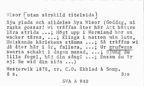 //// Wisor Tutan särskild titelsida ! //// l j //// Sju glada och alldeles Nya Wisor (Goddag, ni raska gossar,' wi träffas åter här Att bättre lära strida Högt upp i Wermland bor en //// wacker tärna, .*.; Klinga i natten min luta, Hwiskande kärlekens stämma Så träffas wi //// då åter här i år, fallera, . <>.; Ur grufwans sv/arta schakt i dagen manad, Sjung du //// lilla fogel, höj din sång! .Ensam du är ej I Se wid din sida ...) //// Westerwik 18 78, tr, C.O. Ekblad & Somp. 8 s. 8:0 //// SVA A 9 40 ////