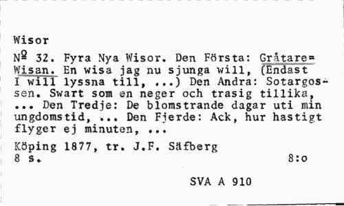 //// Wisor //// N§ 32. Fyra Nya Wisor. Den Första: Gråtare» Wisan. En wisa jag nu sjunga will, (Endast I will lyssna till, ...) Den Andra: Sotargos-sen. Swart som en neger och trasig tillika, ... Den Tredje: De blomstrande dagar uti min ungdomstid, ... Den Fjerde: Ack, hur hastigt flyger ej minuten, ... //// Köping 1877, tr. J.F. Säfberg 8 s » 8: o //// SVA A 910 ////