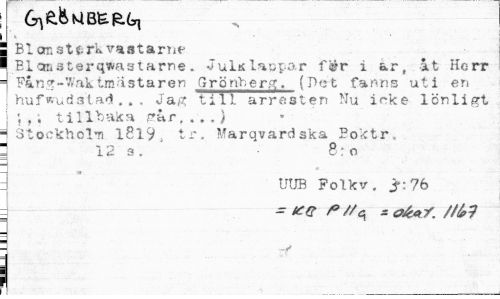 //// * //// [ Blanattrkvaatarne. //// I Blcmäterqwaatarne. Julklappar fér i ar, at Horr //// * Fa n g - '-Vak tro a staren Grönberg. (I> e t fa n n s u t i en hufwud3tad... Jag till arresten Nu icke lönligt *, , . tillbaka par, . . .} ] Stockhölu 1819, tr. Marqvardska Poktr. //// | 12 s. 8:o //// - *. ¦ //// : ' UUB Folk v. jr: 76 //// ~!cq sattfå //// ! P ////