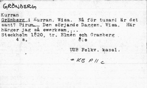//// Gjft&si b //// Kurran //// Grönberg i Kurran. Wisa. Nå för tusanl är det sant? Pirunw.. Den sörjande Daggen. Wisa» Här hänger jag så owerksam , ,.. Stockholm 1820, tr. Elmén och Granberg . 4 s. 8: o //// UUB Folkv. kaosl. //// > //// * k<s p // 0 ////