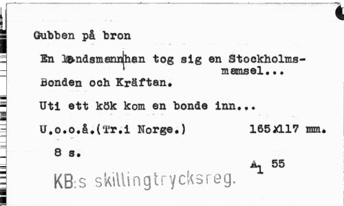 //// i //// ¦ //// | Gubben på "bron //// - En i&ndsmennlhan tog sig en Stockholms» _ mamsel.•« //// Bonden och Kräftan, //// s uti ett kök kom en bonde inn.,. //// I //// - U.o.o.å.(l'r.i Norge.) 165*117 mm. : 8 s. //// a 55 //// | KB:S skillingtrycksreg. ////