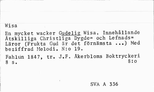 //// Wisa //// En mycket wacker Gudelig Wisa. Innehållande Åtskilliga Christliga Dygde= och Lefnads= Läror (Frukta Gud är det förnämsta ...) Med beziffrad Melodi. N:o 19. //// Fahliin 1847, tr. J.F. Åkerbloms Boktryckeri 8 s. 8:o //// SVA A 336 ////