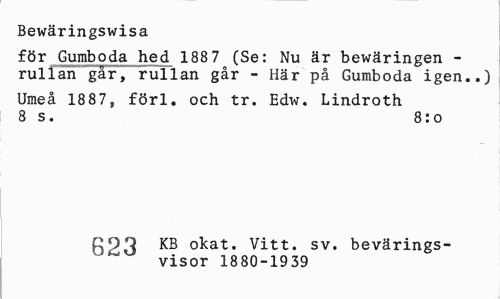 //// Bewäringswisa //// för Gumboda hed 1887^(Se: Nu är bewäringen -rullan går, rullan går - Här på Gumboda igen..) //// Umeå 1887, förl. och tr. Edw. Lindroth 8 s. 8:o //// COQ KB okat. Vitt. sv. bevärings- //// visor 1880-1939 ////