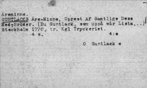 //// mm ' //// Äreminne. //// GUNTLACKS Åre-Minne, Uprest Af Samtlige Des» iTedyB roder. (Du Guntlack, serc uppå wår Lista,..) Stockholm 1770,- tr. Kgl Tryckeriet. //// 4 s . 4;o //// 0 Guntlaek « ////