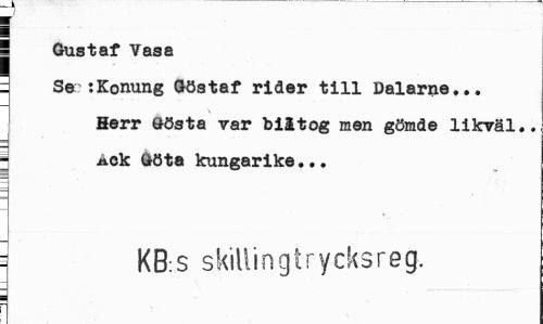//// i //// j Gustaf Vasa //// : Se :Konung Göstaf rider till Dalarne... //// Herr öösta var biltog men gömde likväl.. 5 Ack Göta kungarike... //// i KB:S skillingtrycksreg. ////