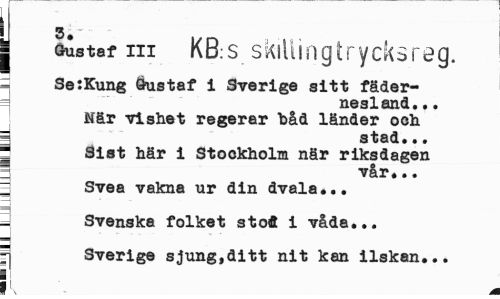 //// 3 //// ¦ Gustaf iii KB:s skillingtrycksreg. //// SetKung Gustaf i Sverige sitt fäder-= nesland... //// När vishet regerar håd länder och 5 stad*.. //// ¦ Sist här i Stockholm när riksdagen =j vår... //// | Svea vakna ur din dvala... //// _ Svenska folket stofl i våda... //// " Sverige sjung,ditt nit kan ilskan... //// I ////
