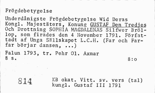 //// Frögdebetygelse //// Underdånigste Frögdebetygelse Wid Deras Kongl. Majestäters, Konung GUSTAF Den Tredjes Och Drottning SOPHIA MAGDALENAS Silfwer Bröllop, som firades den 4 November 1791. Förfat-tadt af Unga Sällskapet L.C.H. (Far och Farfar börjar dansen, ...) //// Falun 1793, tr. Pehr 01. Axmar 8 s. 8:o //// Cl* KB okat. Vitt. sv. vers (tal) //// J11 kungl. Gustaf III 1791 ////