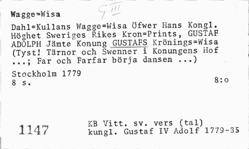 //// Wagge=Wisa / //// Dahl=Kullans Wagge=Wisa Öfwer Hans Kongl. Höghet Sweriges Rikes Kron=Prints, GUSTAF ADOLPH Jämte Konung GUSTAFS Krönings=Wisa (Tys11 Tärnor och Swenner i Konungens Hof Far och Farfar böria dansen c..) //// Stockholm 1779 //// 8 s. 8:0 //// i - n KB Vitt. sv. vers (tal) //// 114/ kungl. Gustaf IV Adolf 1779-35 ////